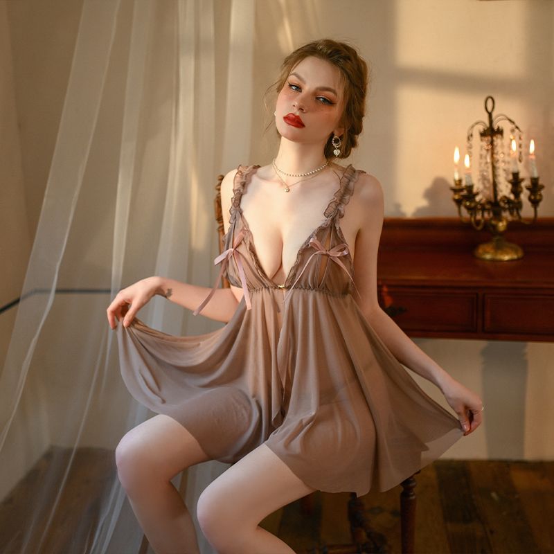 (情趣内衣)羞羞宝贝性感网纱透视睡裙(豆沙)
